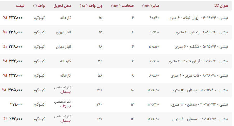 🗓 دوشنبه 20 آذر ماه 1402 👈#نبشی، قیمت ها بدون تغییر نسبت به روز گذشته نبشی 10 ضخامت 10- 6متری ⬅️ 23500 تومان نبشی 12 ضخامت 12- 12متری ⬅️ تماس بگیرید ...