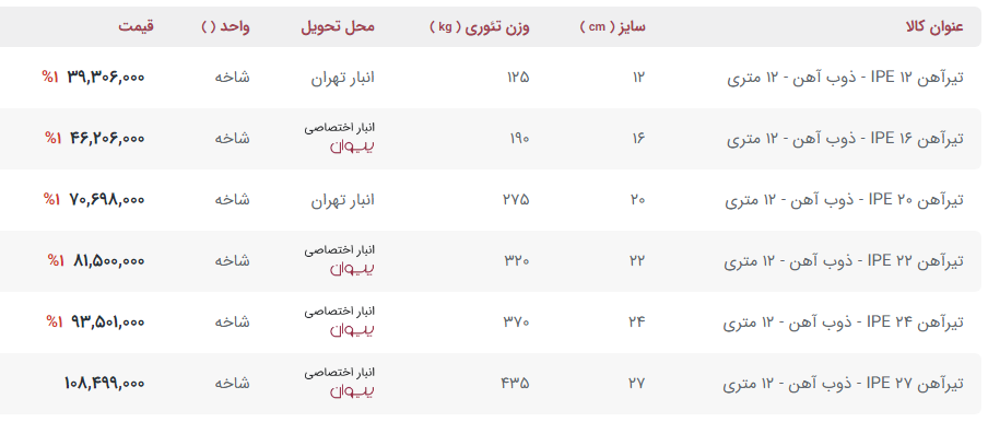 🗓 یکشنبه 19 آذر ماه 1402 👈 تیرآهن IPE طول ۱۲ متر 🔶 بارگیری از کارخانه تیرآهن 14 ذوبی ⬅️ 27800 تومان 🔶 بارگیری از کارخانه تیرآهن 14 ...