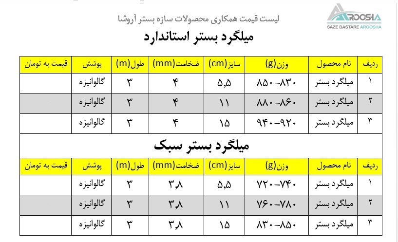 اعلام موجودی میلگرد بستر بستر ضخامت 3.8 سایز 5.5 گالوانیزه 10/000 شاخه قیمت هرشاخه 30/000 بستر ضخامت 4 سایز 5.5 گالوانیزه 10/000 شاخه قیمت هر شاخه 30/500 بستر ...