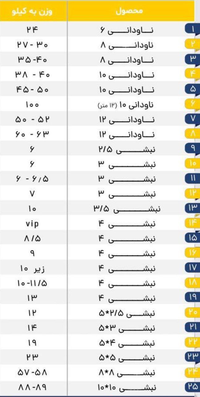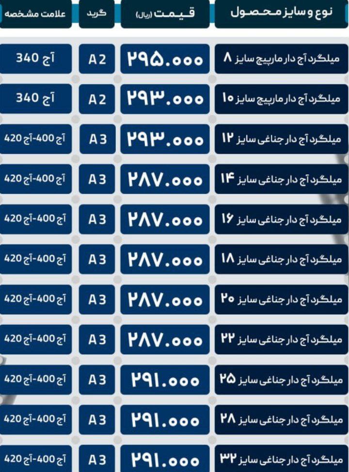 فولاد راد همدان سایز8 👈 327850 سایز 10 👈 317850 سایز12 👈 310850 سایز14 👈 307850 سایز16 👈 307850 سایز18 👈 307850 سایز20 👈 3078 ...