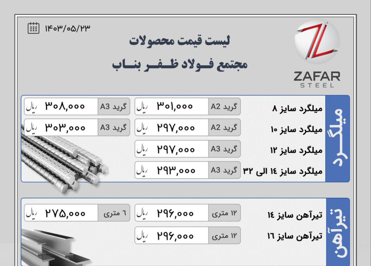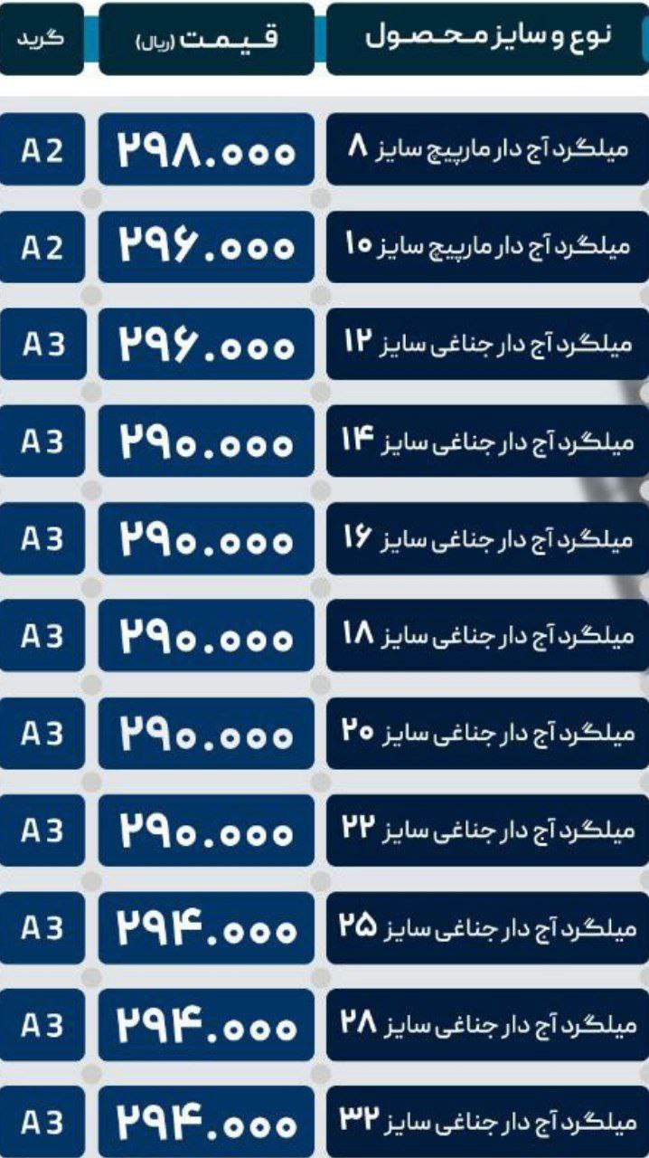 آذر فولاد امین تیکمهداش میلگرد آجدار A2 سایز 8: 305000 میلگرد آجدار A2 سایز10: 300000 میلگرد آجدار A3 سایز 12: 300000 میلگرد آجدار A3 سایز 14 الی 32 : ...