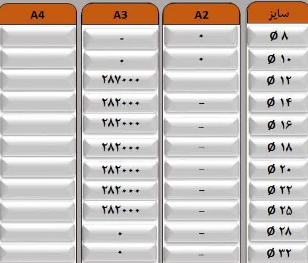 فولاد کاوه تیکمه داش میلگردهای آجدار: گرید A2 سایز 8 : 30000 گرید A2 سایز 10 : 29,700 گرید A3 سایز 12 : 29,700 گرید A3 سایز 14 _ 32 : 29,300 گرید A3 سایز 8 ...