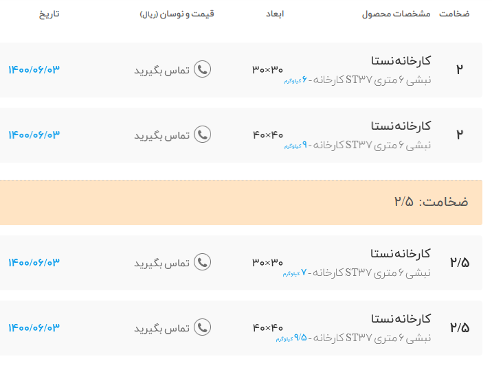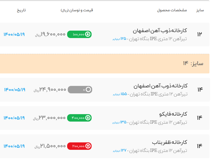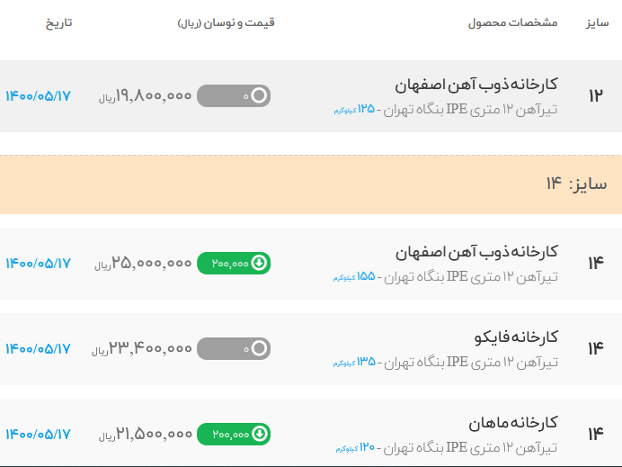 #تیرآهن ماهان در انبار تهران 🗓 یکشنبه 17 مردادماه 1400 🗓 سایز 14 : 2.150.000 سایز 16 : 2.950.000 سایز 18 : 3.600.000 📌ارتباط با کارشناسان فروش :👇🏻 ...