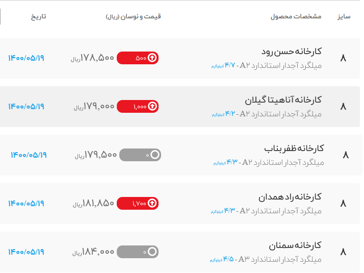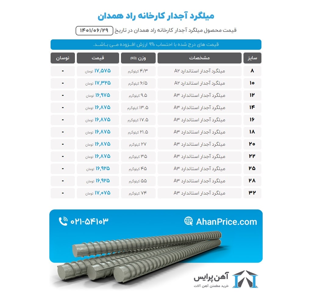 #میلگرد_آجدار کارخانه راد همدان 🗓سه شنبه 19 مردادماه 1400 🗓 افزایش 170 تومانی 🔺 💠 استاندارد A2 💠 سایز 8 : 18185 سایز10: 17935 ...
