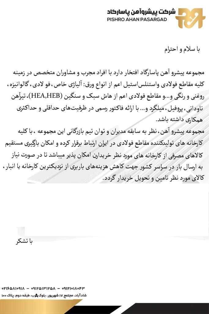 شرکت پیشرو آهن پاسارگاد تامین کننده آهن آلات صنعتی و ساختمانی شامل : ورق (st37-st52-a516gr70-ck45 )هاش (سبک و سنگین) ناودانی ، نبشی ، میلگرد(آجدار A2-A3-A4 ,آلیاژی)، تیرآهن ، پروفیل و... میباشد.