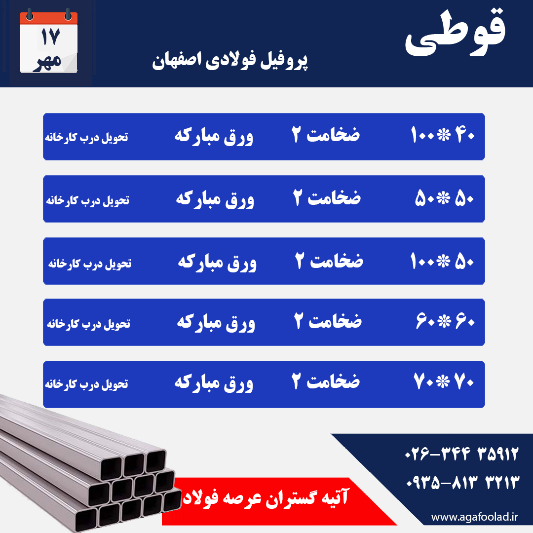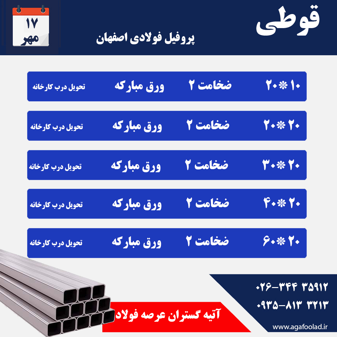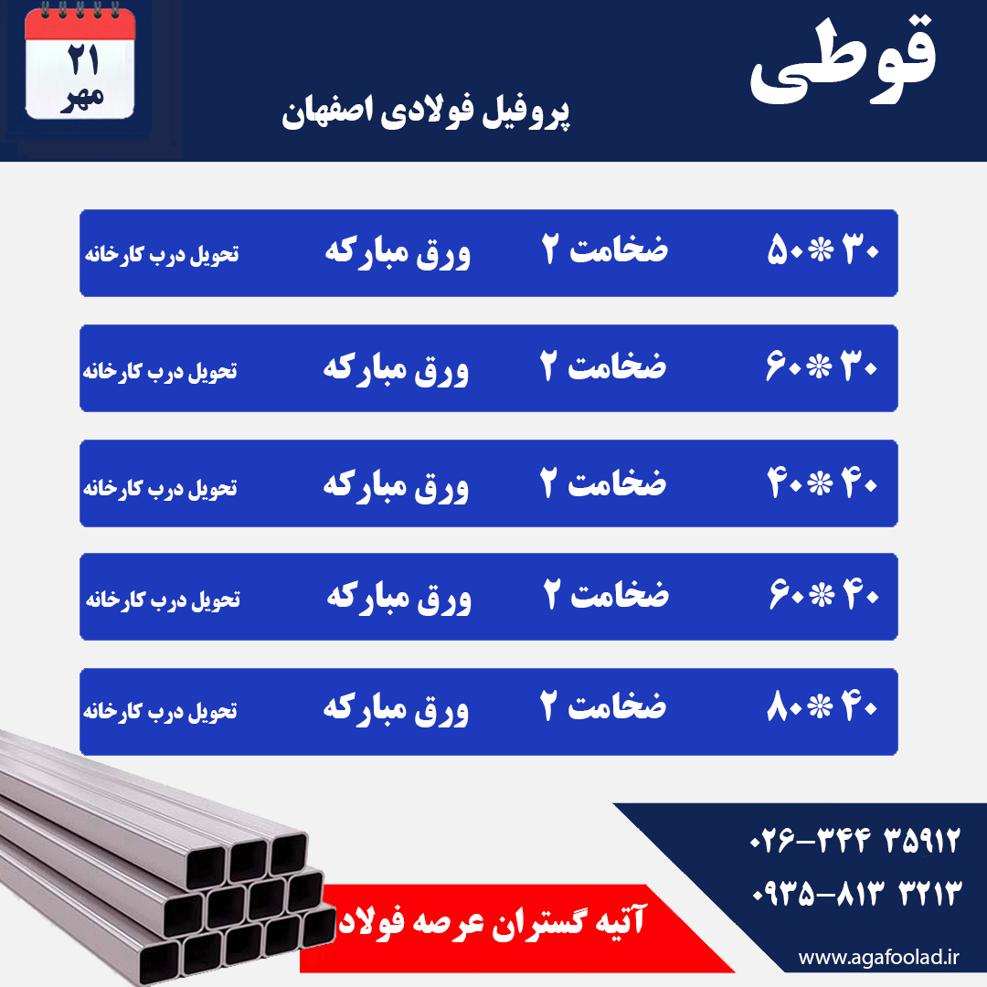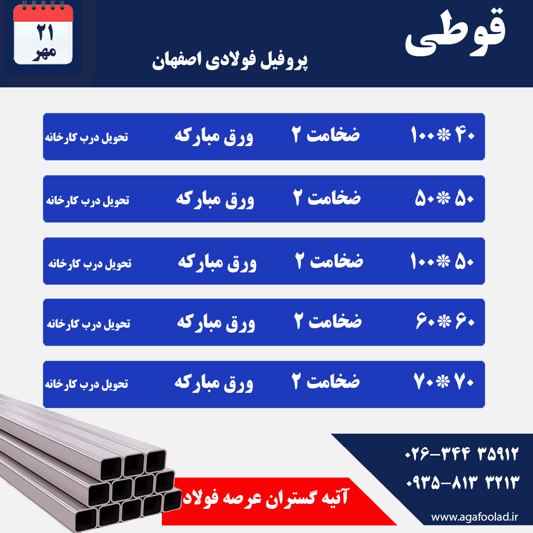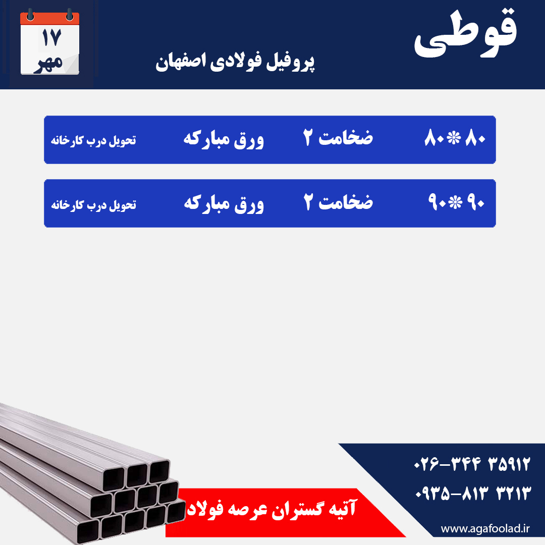 قوطی ضخامت ۲ قوطی ضخامت ۲/۵ تولید : پروفیل فولادی اصفهان تحویل : کارخانه جهت استعلام قیمت با ما در ارتباط باشید 0935-8133213 026-34435912 www.agafoolad.ir آت ...