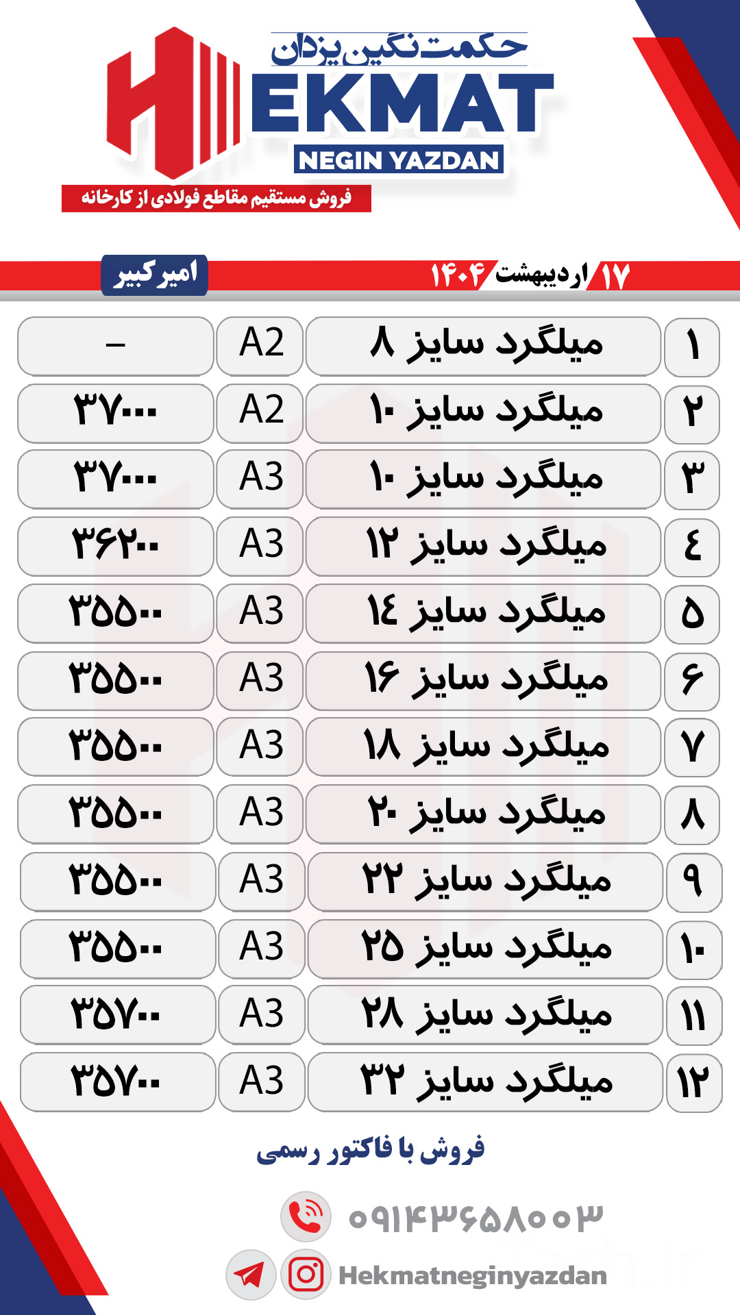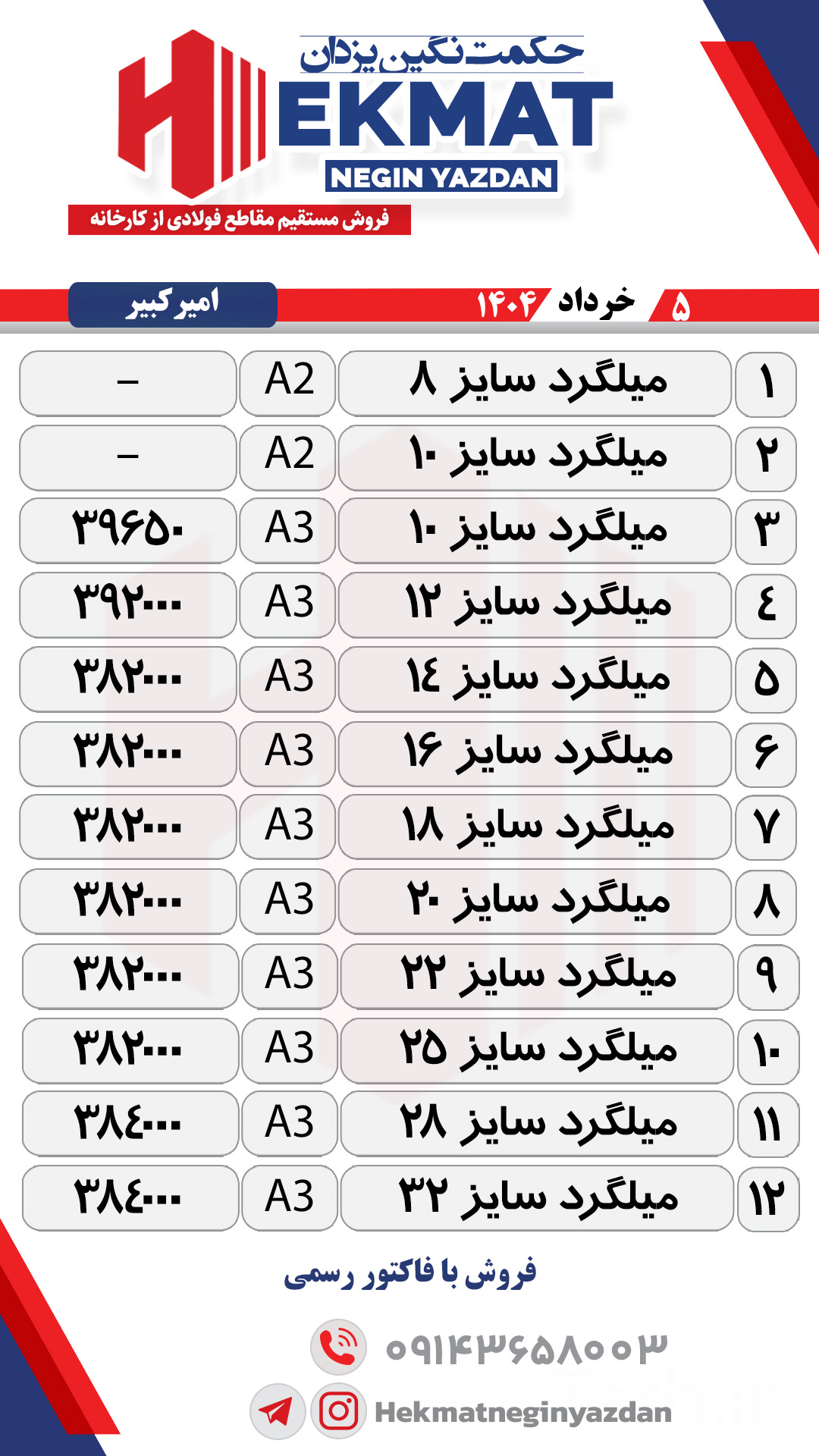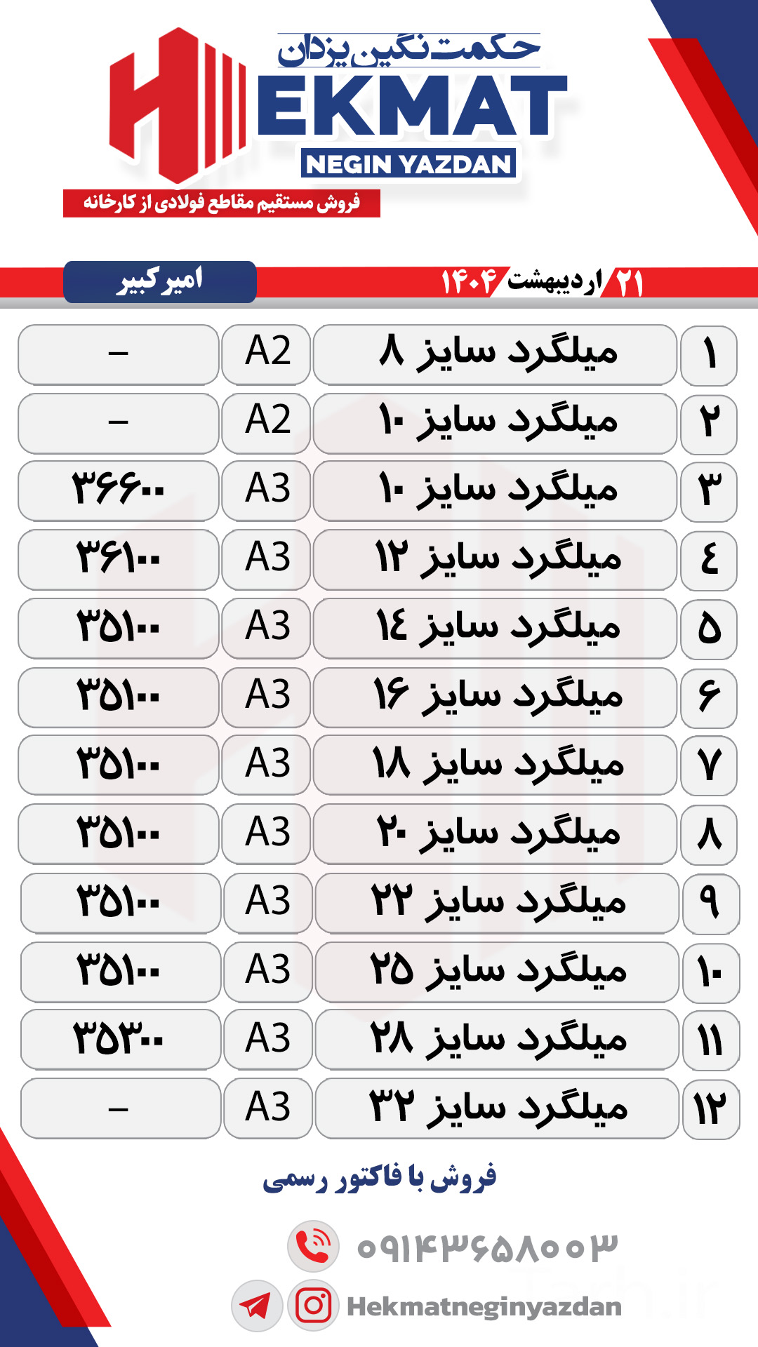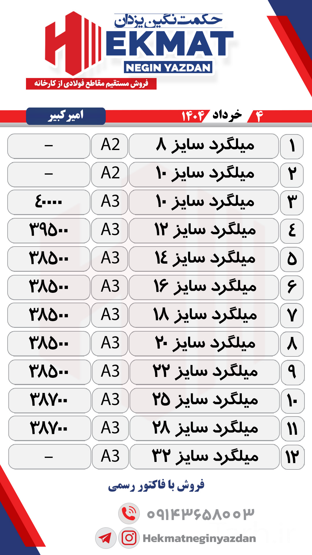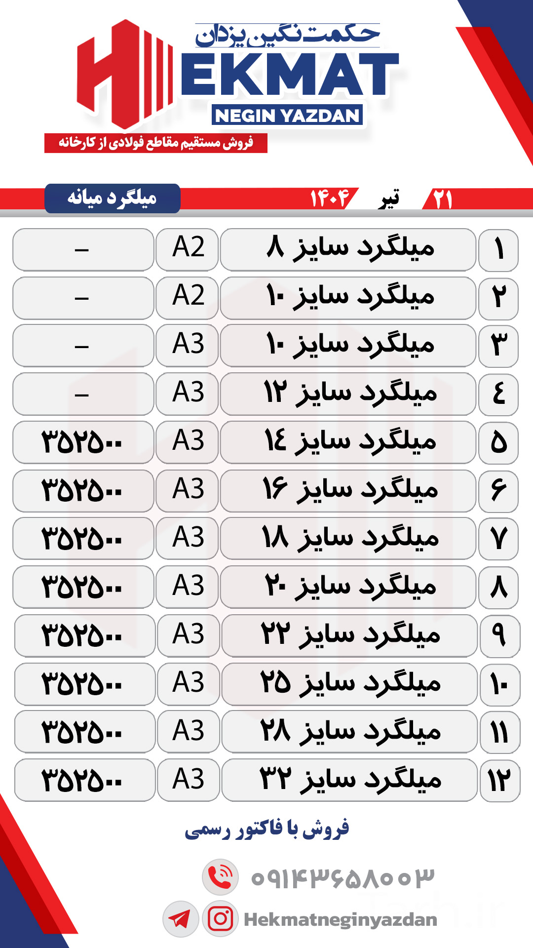 میلگرد میانه تخفیف پای آدرس سریع بار 1404/04/21 بازرگانی حکمت نگین یزدان کانال تلگرام: https://t.me/Hekmatneginyazdan تلفن: ☎️ 09143658003