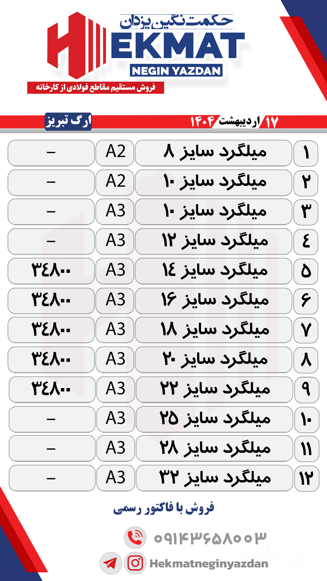 📣 میلگرد موجود امروز7 مرداد 1404: ✅ میانه ✅ تاکستان ✅ ارگ تبریز ✅ امیرکبیر 🚛 موجودی انبار آماده ارسال 📦 خرید مستقیم از کارخانه 📞 جهت ثبت سفارش و تخفیف تماس بگ ...