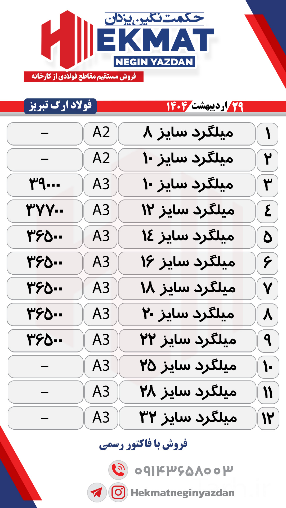 اعلام موجودی فولادارگ تبریز 1404/02/29 بازرگانی حکمت نگین یزدان کانال تلگرام: https://t.me/Hekmatneginyazdan تلفن: ☎️09143658003