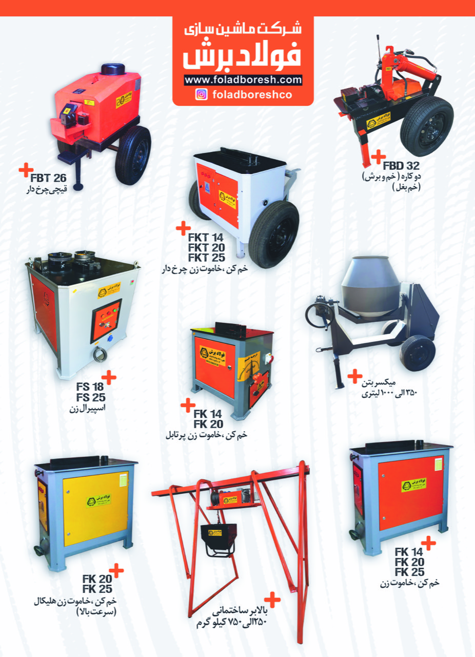 تولید کننده دستگاه های خمکن،خاموت زن از سایز ۱۴ الی ۶۰. تولید کننده دستگاه های برش میلگرد از سایز ۱۲ الی ۶۰. تولید کننده دستگاه های دوکاره(خم و برش) از سایز ۲۵ الی ۳۶. تولید کننده بالابر ساختمانی از ۲۵۰ الی ۱۰۰۰ کیلو گرم. تولید کننده میکسر بتن(بتونیر) از ۳۵۰ الی ۱۰۰۰ لیتری.