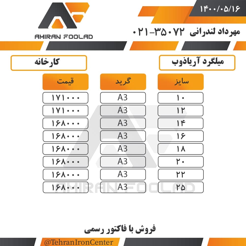 موجودی میلگرد آناهیتا کارخانه جهت اطلاع از قیمت بدون فاکتور تماس بگیرید.