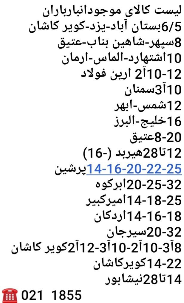 6/5کاشان 25900 8آ3کویر کاشان 27000 10آ3ارین فولاد 25700 10آ2کاشان 25800 12آ2کاشان 25600 🔹 موجوددرانبار باران🔹 https://t.me/foladbaran