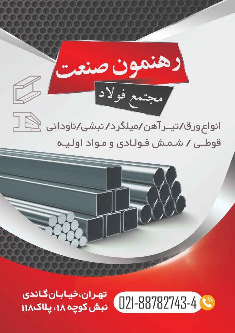 مجتمع فولاد رهنمون صنعت 🟡تأمین و توزیع انواع: 🔻مقاطع فولادی 🔻انواع میلگرد 🔻تیرآهن 🔻نبشی و ناودانی 🔻انواع ورق فولادی 🔻شمش فولادی و مواد اولیه تلفن ثابت: 8878 ...