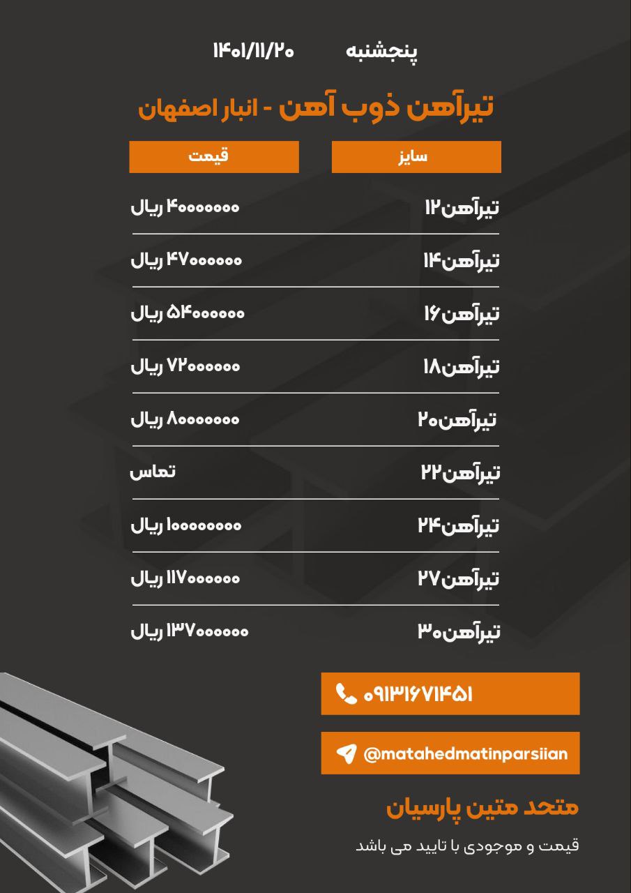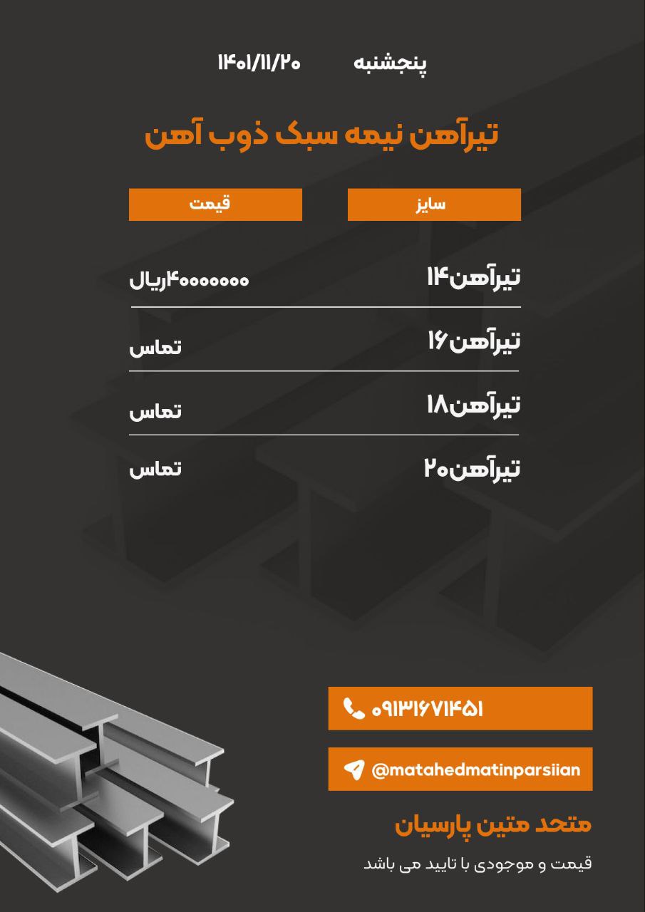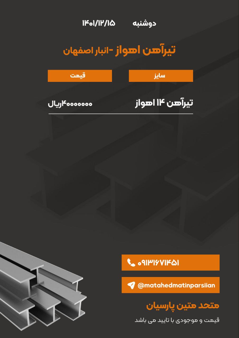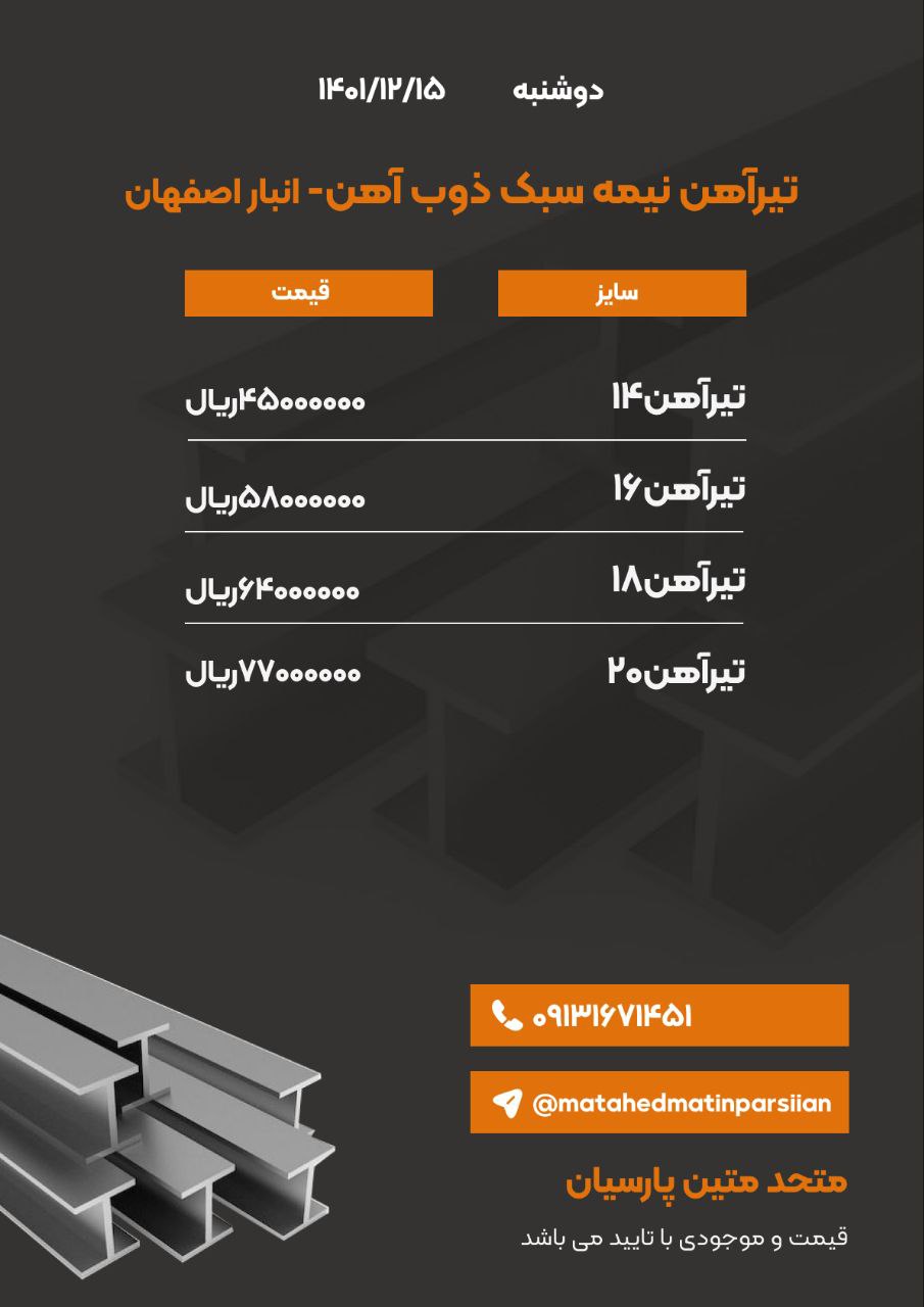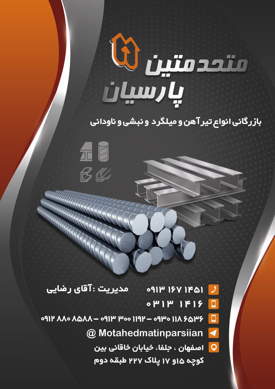 #متحد متین پارسیان🔅تامین کننده انواع مقاطع فولادی⚜️تیرآهن ⚜️تیرآهن نیمه سبک ⚜️میلگرد ⚜️نبشی ⚜️ناودانیراه های ارتباط با ما : 📍اصفهان-جلفا-خیابان خاقانی بی ...