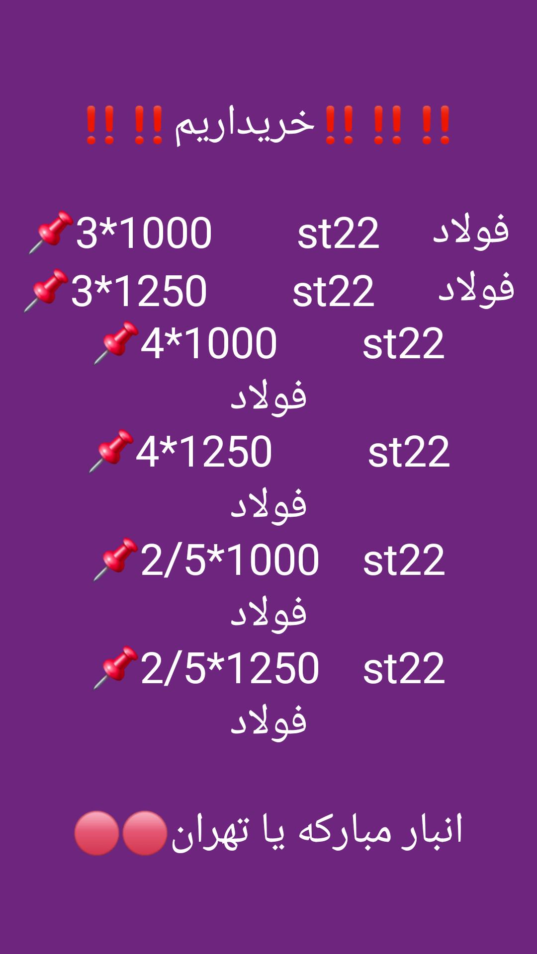 خریداریم‼️‼️ 📌3*1000 st22 فولاد 📌3*1250 st22 فولاد 📌4*1000 st22 فولاد 📌4*1250 st22 فولاد 📌2/5*1000 st22 ...