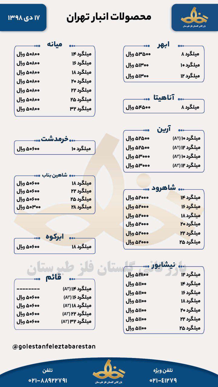 *محصولات #انبار_تهران* تاریخ:۱۳۹۸/۰۹/۱۹ میلگرد ۸ ابهر : ۵۲۳۰۰ میلگرد ۸ آناهیتا : ۵۲۶۰۰ میلگرد ۱۰ خرمدشت : میلگرد ۱۰ A2 آرین : ۵۱۰۰۰ میلگرد ۱۰ A3 آرین : ۵۱ ...