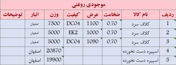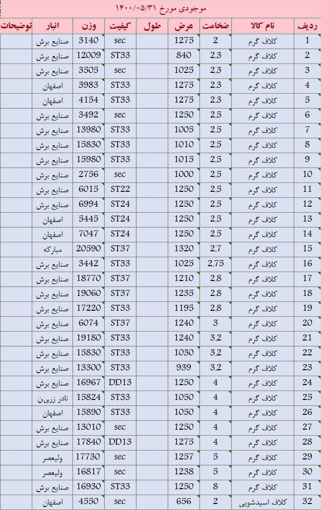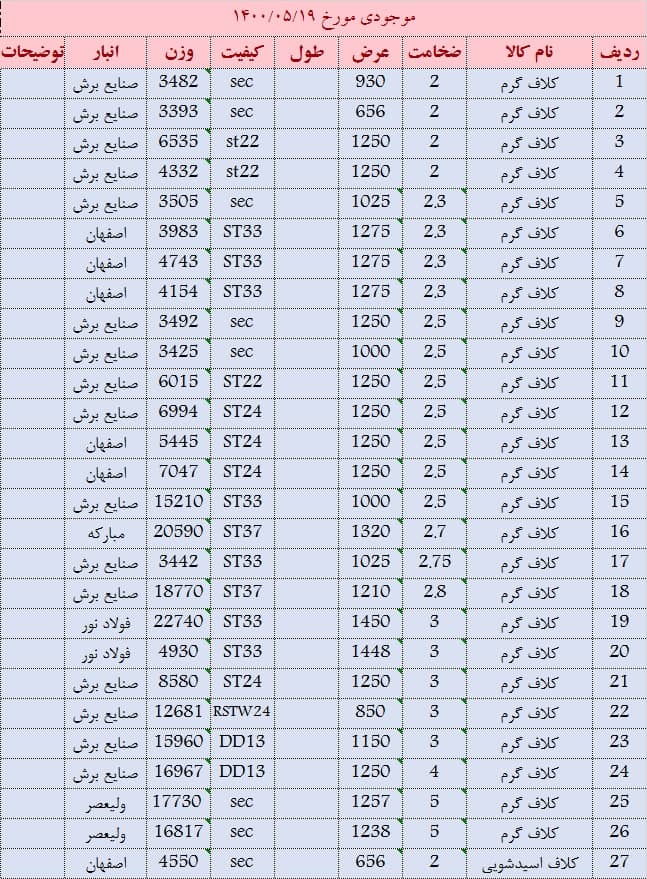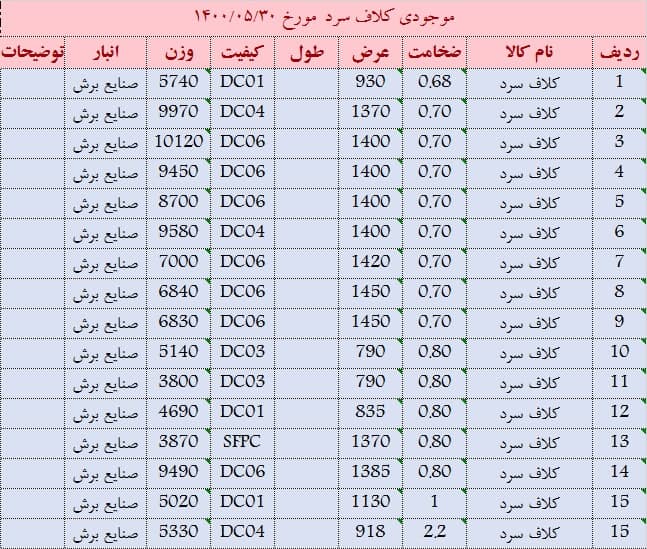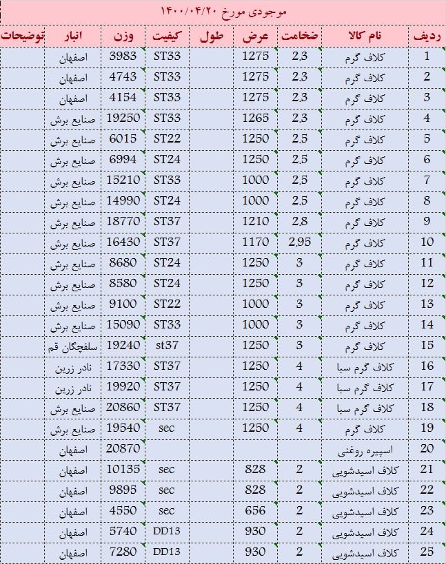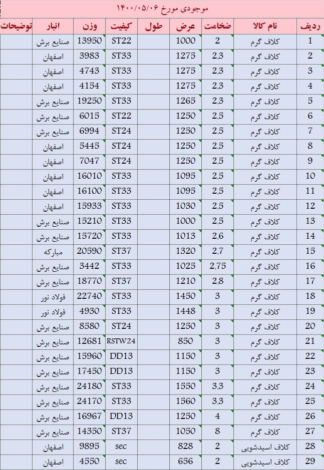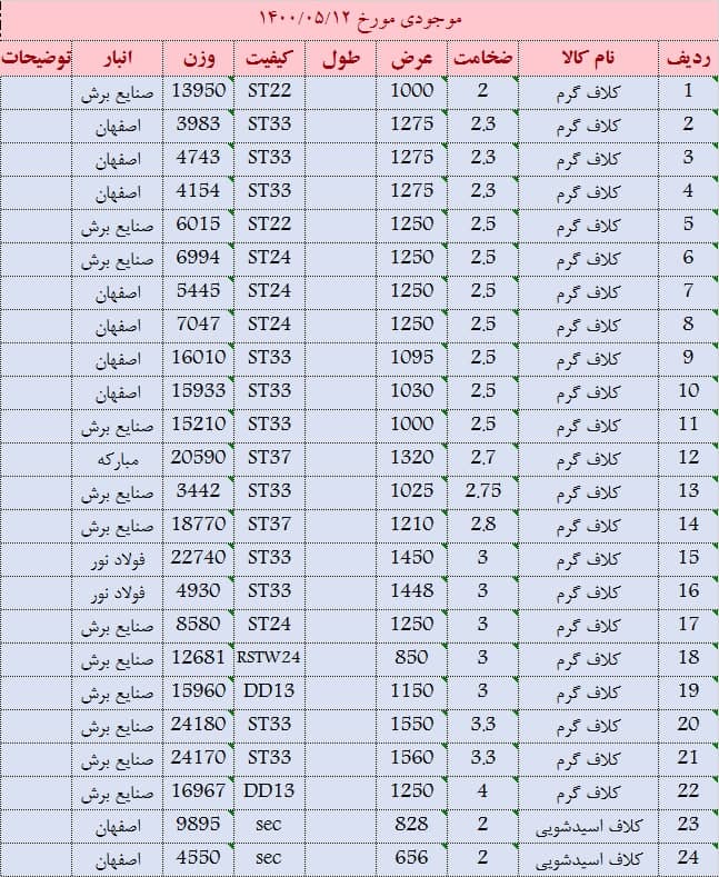 کلاف گرم 6 عرض 1100 موجود است کلاف گرم 8 عرض 1150 موجود است کلاف گرم 5.8 عرض 1120 موجود است کلاف گرم 5.9 عرض 1105 موجود است کلاف گرم 2 و 4 عرض 1000 موجود است