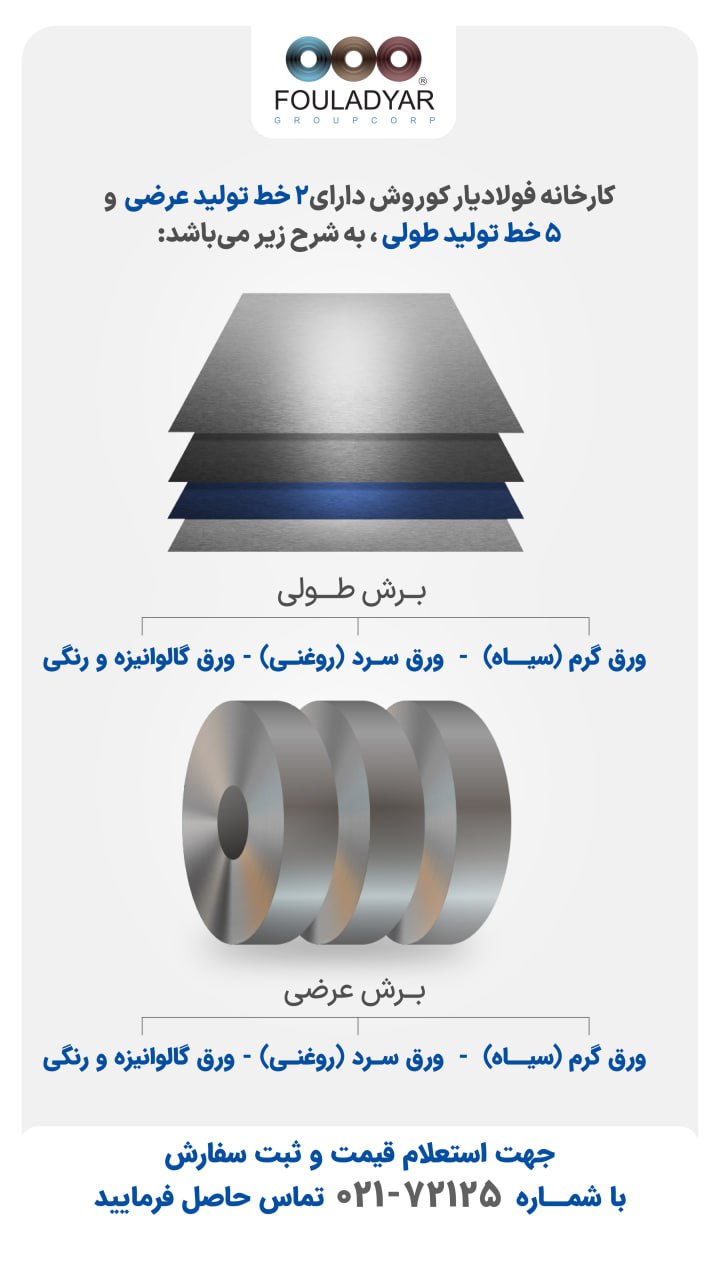 ورق رنگی, ورق روغنی (سرد), ورق گالوانیزه, ورق گرم (سیاه), پروفیل, قوطی ستونی, ارائه خدمات, تجهیزات و ماشین آلات