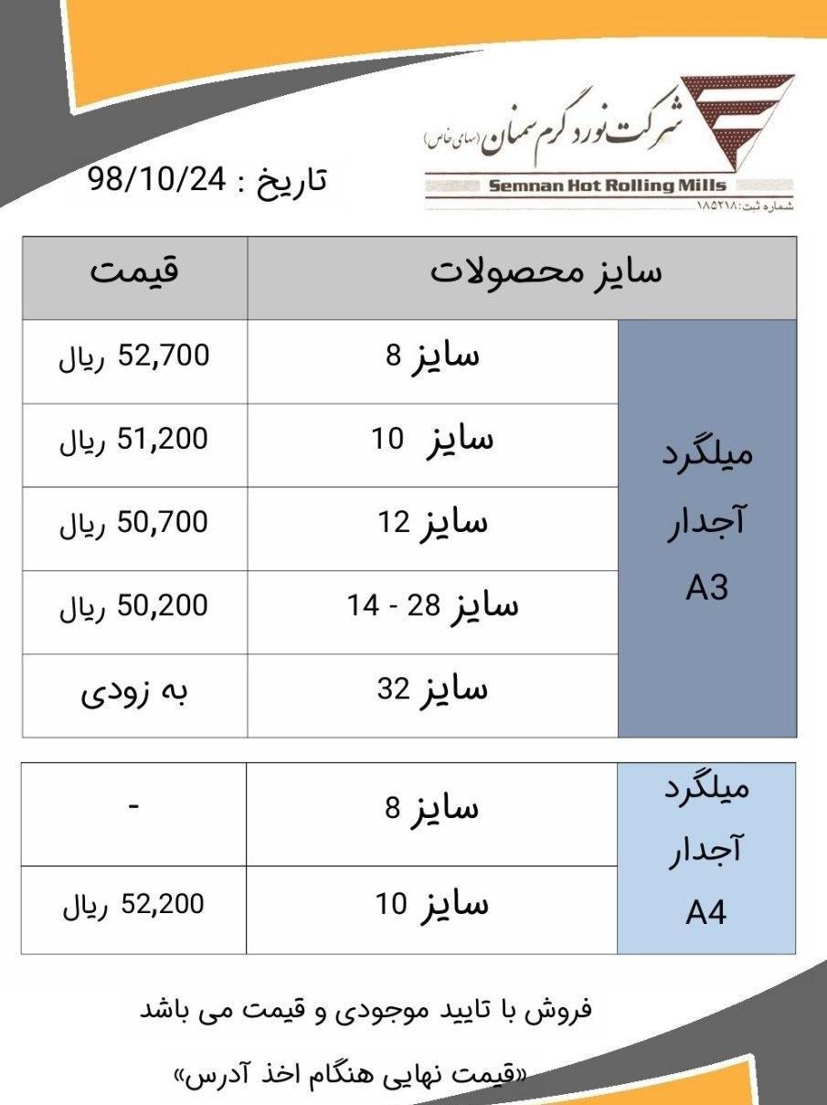 #نورد_گرم_سمنان نسبت به آخرین اعلام رسمی قیمت امروز محصولات خود را #ثابت اعلام کرد. A3 8 : 5300 A3 10 : 5150 A3 12 : 5100 A3 14 : 5050 ...