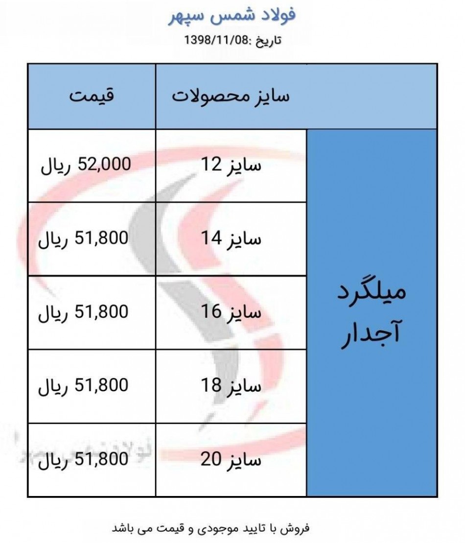 سیرجان A2 8 : 5250 A2 10 : 5200 A2 12 : 5150 A3 12 : 5150 A2 14 : 5100 A3 14 : 5100 A2 16 : 5100 A3 16 : 5 ...