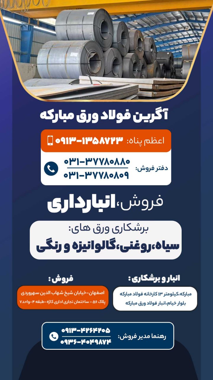 #آگرین_فولاد_ورق_مبارکه اعظم پناه 🔹فروش،انبارداری و برشکاری ورق های سیاه،روغنی،گالوانیزه و رنگی 🏗 انبار و برشکاری : مبارکه،کیلومتر ۱۳ کارخانه فولاد مبارکه،بلوار ...