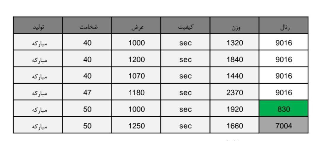 #اصفهان_فولاد ضخامت 1/5 میل 1250 St.22 سبا ضخامت 1/5 میل 1000 St.37 فولاد ضخامت 1/8 میل 1250 St.37 سبا ضخامت 2.5 میل 1235 St.22 ...