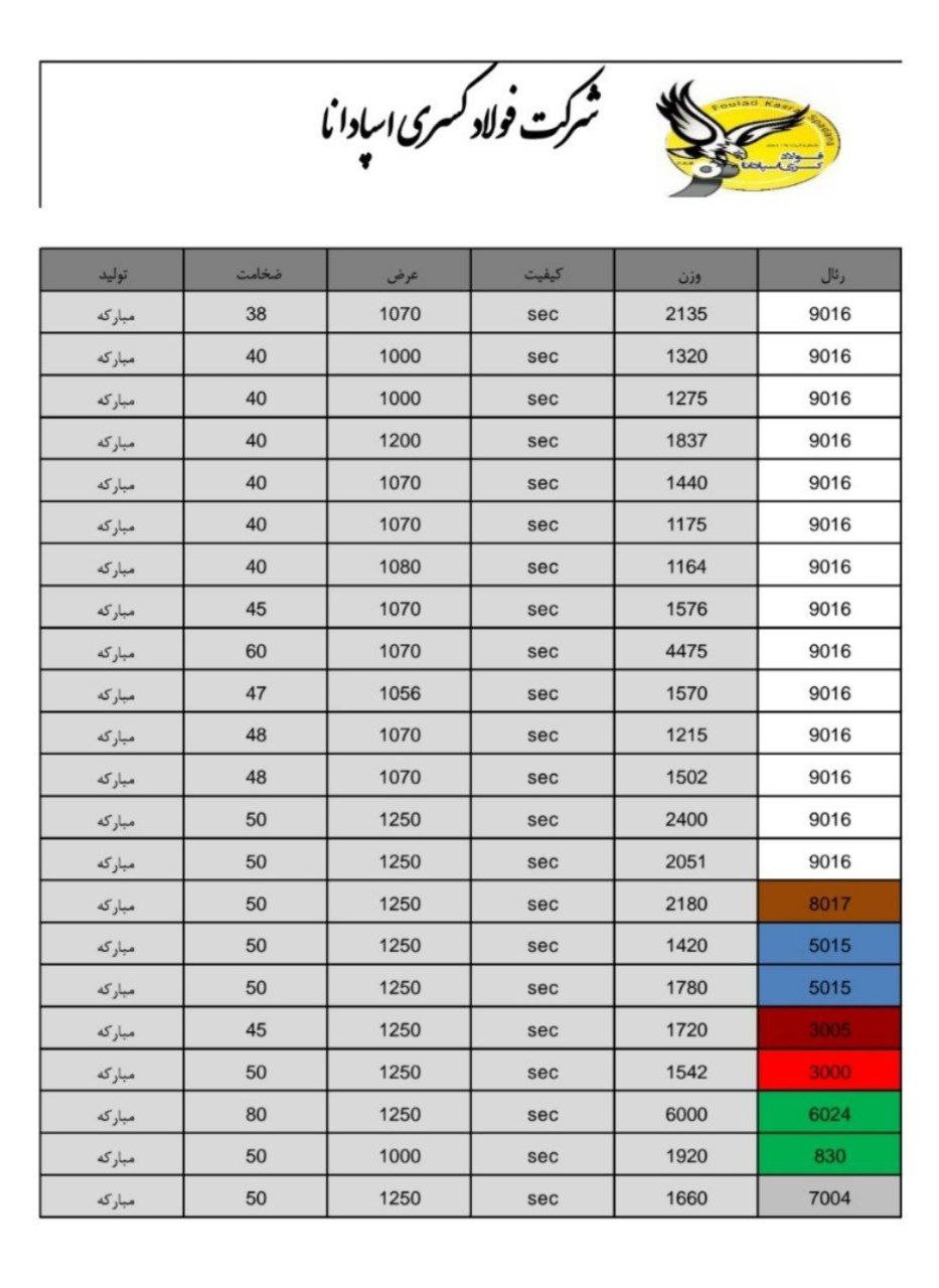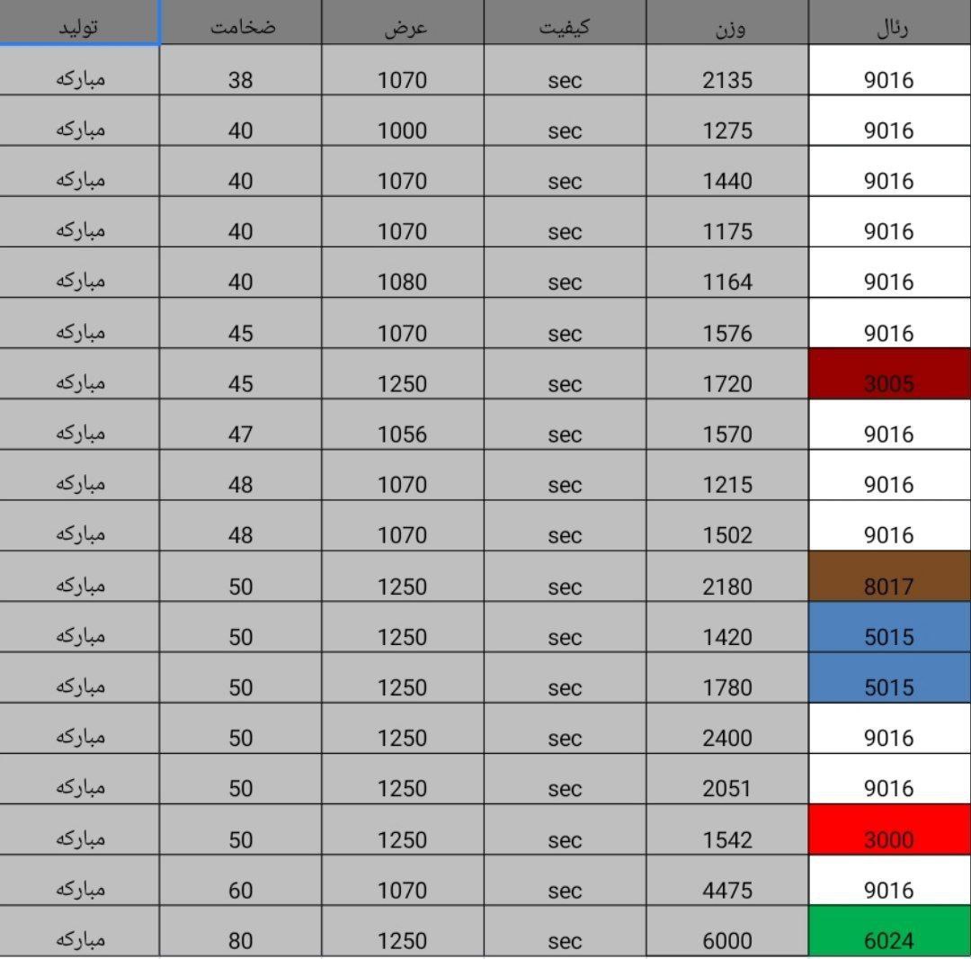 #فولاد_کسری_اسپادانا ورق رنگی فولادمبارکه 🔵 50 * 1250 🔴 50 * 1250 🟠 50 * 1250 ⚪️ 50 * 1250 🔘 50 * 1250 🟤 50 * 1250 انبار اصفهان ورق س ...