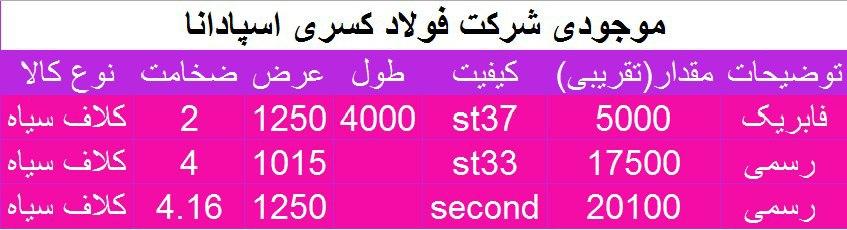 4*1250 درجه ۲ سبا بافاکتور رسمی 10*1050 st33 فولاد 10*1500 a516 گرید70 4.8*1500 st37 فولاد شماره های تماس فولادکسری اسپادانا 03136940000 لینک عضو ...
