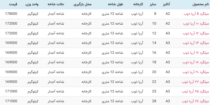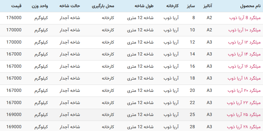 چهارشنبه 23 خرداد ماه 1400 📢 #قیمت_میلگرد_آجدار_آریا_ذوب ⏺ بدون تغییر قیمت نسبت به روز قبل بارگیری از کارخانه میلگرد 8 A2 قیمت 👈 17800 میلگرد 1 ...
