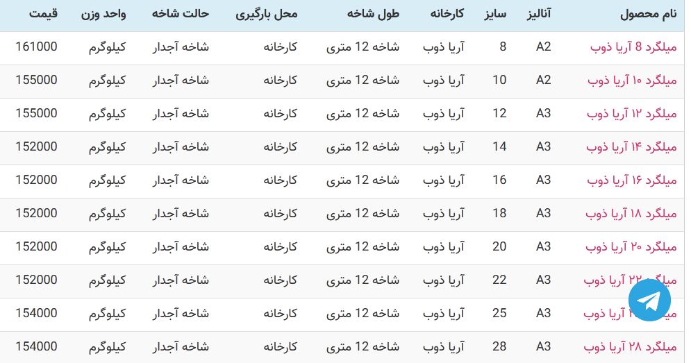 دوشنبه 7 تیر ماه 1400 📢 #قیمت_میلگرد_آجدار_آریا_ذوب ⬆️ 100 تومان افزایش قیمت نسبت به روز قبل بارگیری از کارخانه میلگرد 8 A2 قیمت 👈 16100 میلگر ...