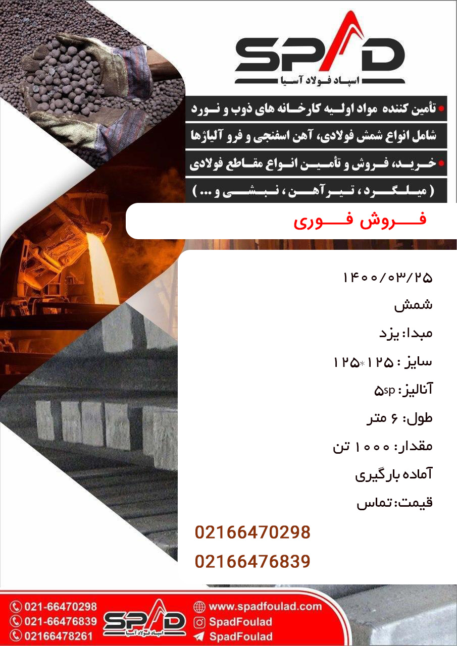 1400/04/09 ⬅️شمش مبدا: یزد سايز: 150*150 آناليز: 5sp طول: 12 متر مقدار: 1000 تن آماده بارگیری قیمت: تماس ۰۲۱۶۶۴۷۰۲۹۸ ۰۲۱۶۶۴۷۶۸۳۹ @SpadFoulad