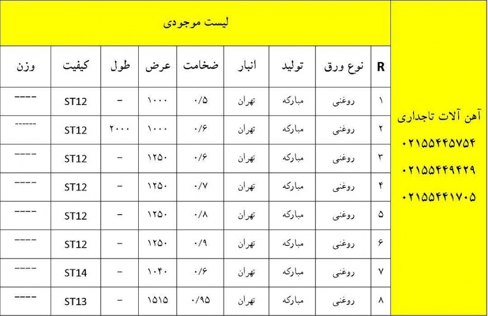 ورق روغني مباركه ضخامت ٠/٧٠ عرض ١٠٠ St12 آبي تهران ورق روغني غرب ضخامت ٠/٤٠ ٠/٤٦ ٠/٤٨ عرض ١٠٠ تهران ورق روغني مباركه سبدي ضخامت ٠/٨٠ عرض ٨١ ضخامت ٠/٨٠ عرض ١ ...