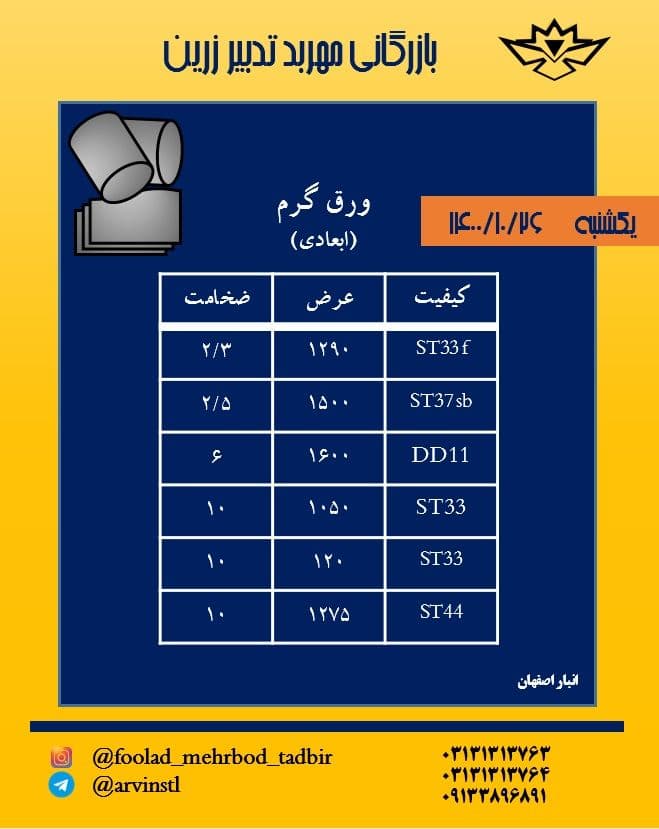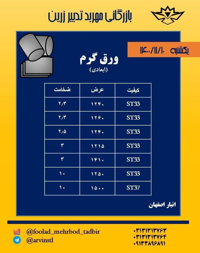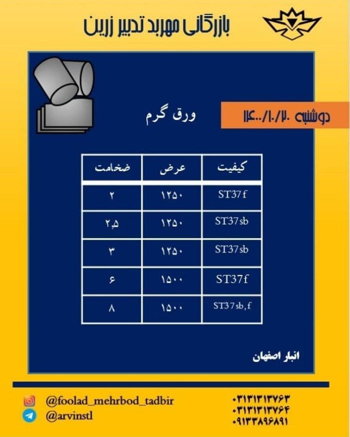 🔴شرکت بازرگانی #مهربد_تدبیر_زرین 🔴 ⭕️ موجودی ورق گیلان ⭕️ ⚫️ ۲ ۱۰۰۰ ⚫️ ۶ ۱۲۵۰ ⚫️ ۸ ۱۲۵۰ ⚫️ ۱۰ ۱۲۵۰ ⚫️ ۱۲ ۱۲۵۰ ⚫️ ۱۵ ۱۲۵۰ ⭕️ موجودی ورق کاویان ⭕️ ...