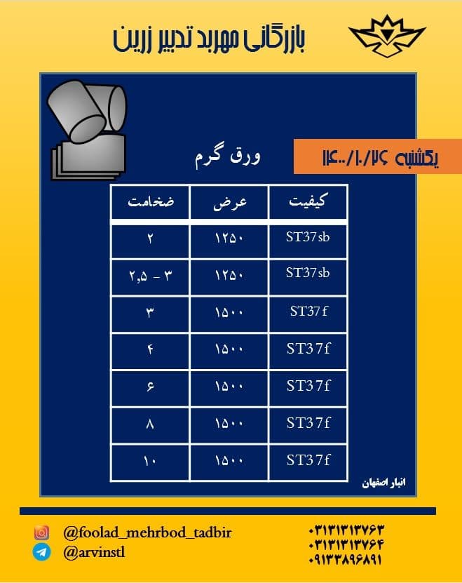 ⭕️ موجودی ورق سیاه ⭕️ ⚫️ 2.5 1250 st37 sb ⚫️ 3 1250 st37 sb ⚫️ 6 1500 st37 f ⚫️ 8 1500 st37 f ⚫️15 1500 st37 f 🔸 انبار اصفهان اعلام قیمت سا ...
