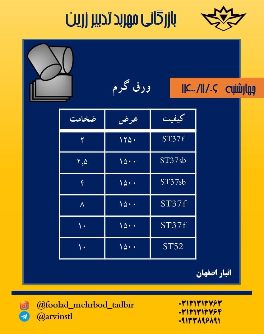 ⭕️ موجودی ورق گیلان ⭕️ 🟧 ۶ ۱۲۵۰ 🟧 ۸ ۱۲۵۰ 🟧 ۱۰ ۱۲۵۰ 🟧 ۱۲ ۱۲۵۰ 🟧 ۱۵ ۱۲۵۰ 🔸 کارخانه تلفن تماس