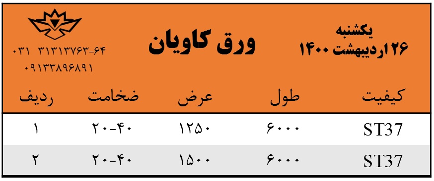 با سلام. موجودی ورق گرم روز شنبه 25 اردیبهشت ماه 1400 جهت استعلام قیمت ها با شماره های زیر تماس بگیرید: 031-31313763 031-31313764 0913-3896891