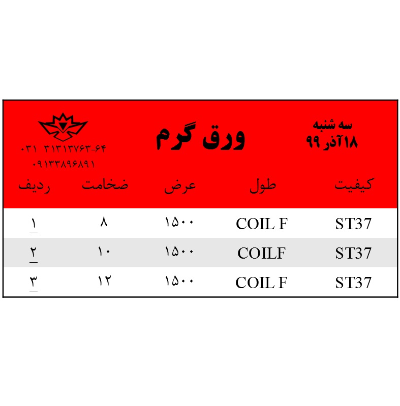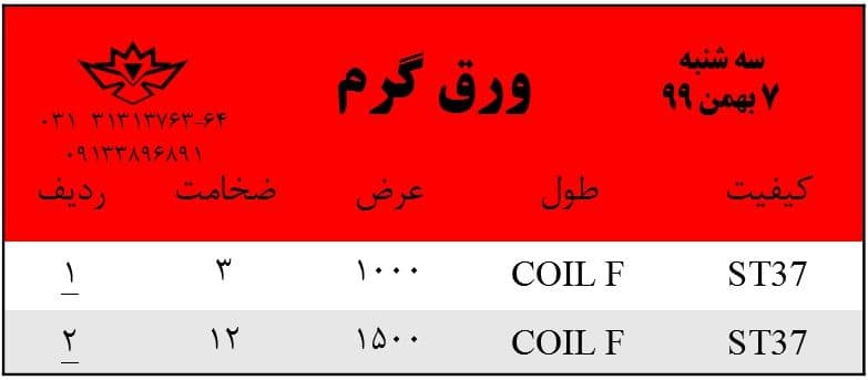 موجودی امروز یکشنبه ۱۶ آذر ۹۹ 4--1250--st37 10-1500--st52 9.8-1500--A516 اعلام قیمت ساعت ۱۳:۳۰ جهت خرید با دفتر شرکت تماس بگیرید ۰۳۱۳۱۳۱۳۷۶۳ ۰۳۱۳۱۳۱۳۷۶۴ ۰۹۱۳۳۸ ...
